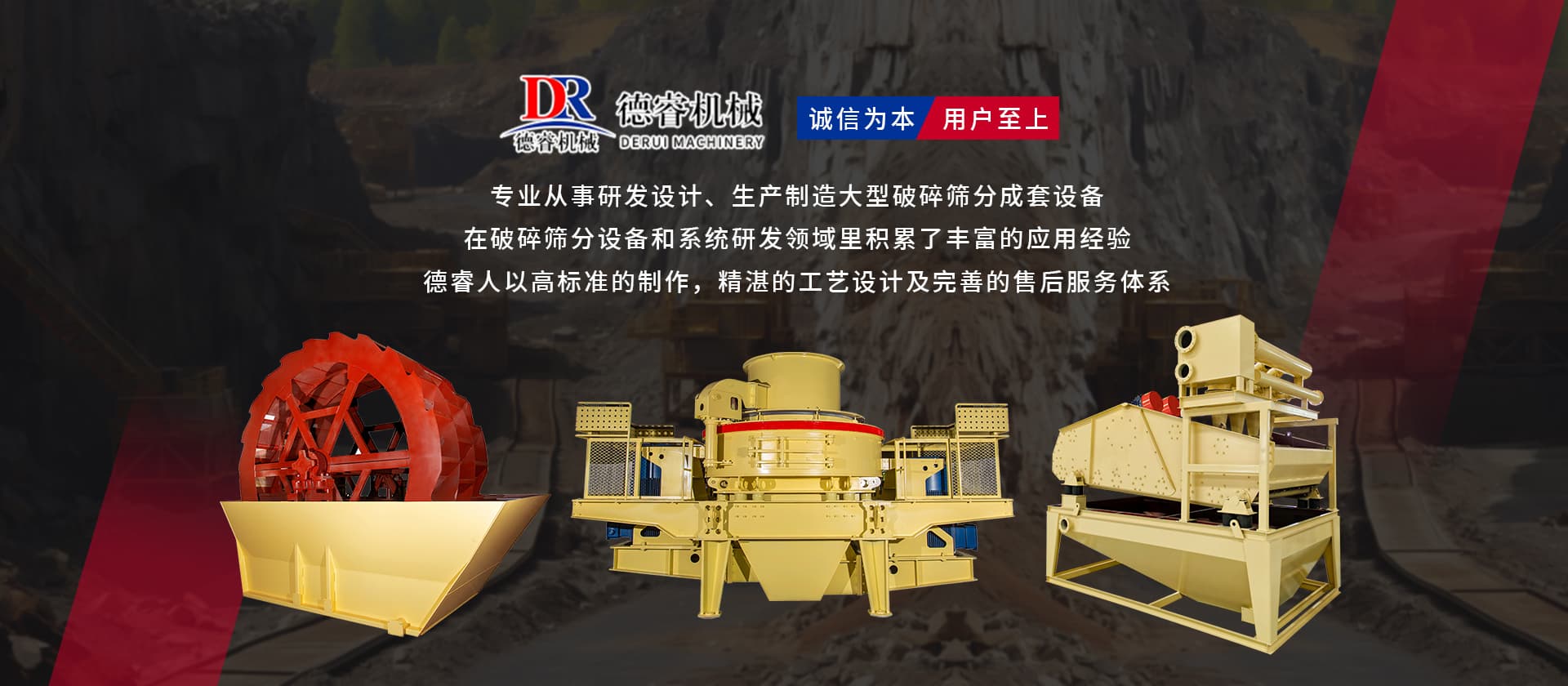 德睿重型機(jī)械是從事研發(fā)設(shè)計(jì)、生產(chǎn)制造大型破碎篩分成套設(shè)備的現(xiàn)代高新技術(shù)企業(yè)集團(tuán),公司總部座落于廣東工業(yè)重鎮(zhèn)、韶關(guān)市湞江區(qū)工業(yè)園,有現(xiàn)代化辦工場(chǎng)地、研發(fā)中心和標(biāo)準(zhǔn)化廠(chǎng)房,多種大型機(jī)械加工設(shè)備10余套,現(xiàn)公司技術(shù)人員40余名。 公司在主要城市均設(shè)有辦事處,配有豐富實(shí)戰(zhàn)經(jīng)驗(yàn)的設(shè)計(jì)工程師,方便為各地客戶(hù)現(xiàn)場(chǎng)分析、配置生產(chǎn)線(xiàn)并提供及時(shí)、周到的售后服務(wù)。 目前產(chǎn)品已覆蓋東南亞、中東、非州、歐州等多個(gè)國(guó)家和地區(qū),并獲得客戶(hù)的好評(píng)。公司已成為主要的專(zhuān)業(yè)礦山設(shè)備,工業(yè)磨粉、碎石制砂設(shè)備的生產(chǎn)和出口基地之一。 “誠(chéng)信為本,用戶(hù)至上”德睿人以高標(biāo)準(zhǔn)的制作,精湛的工藝設(shè)計(jì)及完善的售后服務(wù)體系在破碎篩分設(shè)備和系統(tǒng)研發(fā)領(lǐng)域里積累了豐富的應(yīng)用經(jīng)驗(yàn)。借助在破碎行業(yè)的豐富經(jīng)驗(yàn),公司可向客戶(hù)提供碎石制砂生產(chǎn)線(xiàn)設(shè)計(jì)、安裝、調(diào)試等交鑰匙工程,同時(shí)承接破碎系統(tǒng)的爆破、裝運(yùn)、破碎等生產(chǎn)運(yùn)行總承包。